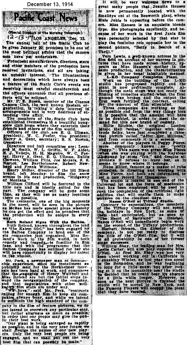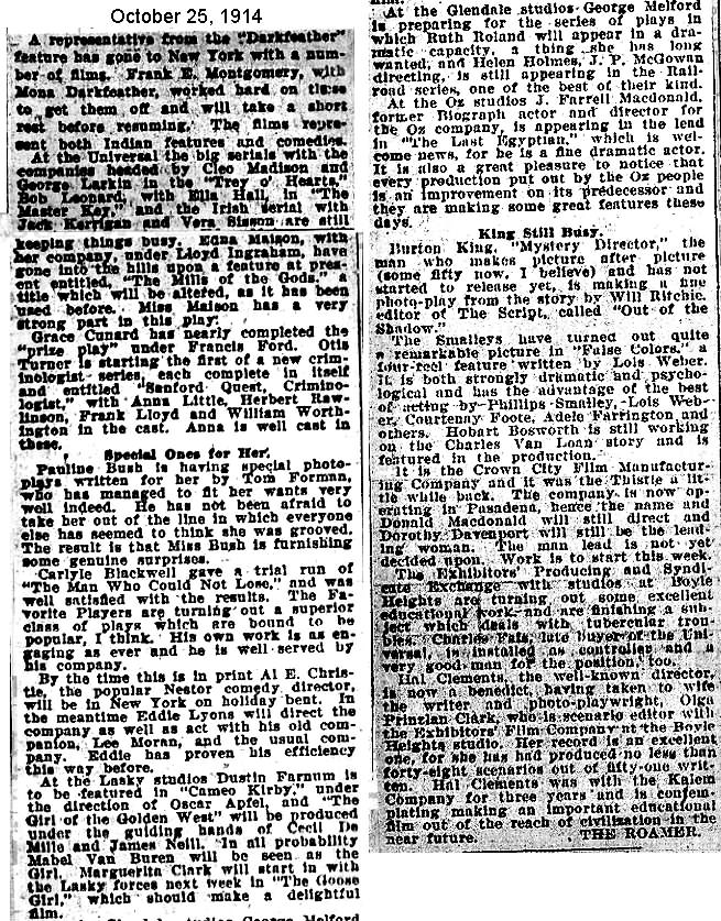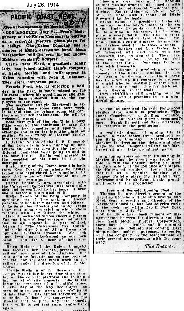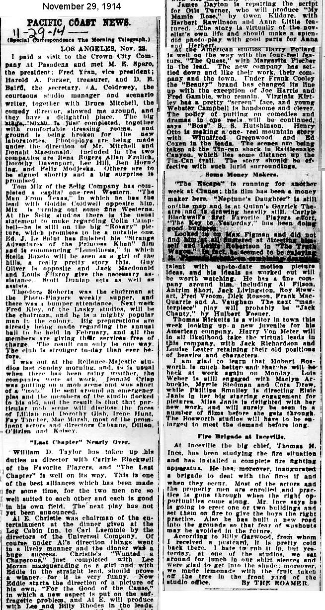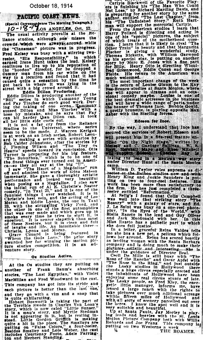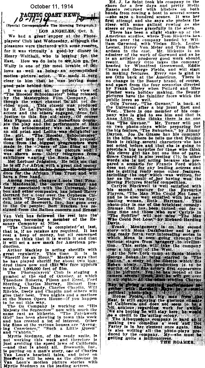During the silent film era, the New York Morning Telegraph had more coverage of the film industry than any other daily New York newspaper; its coverage included a weekly column of movie news from Los Angeles, initially titled “Pacific Coast News.” As the film industry in Hollywood expanded, that column also grew in size. Many of the “news items” came directly from publicity agents, but they still provide a useful historic glimpse into Hollywood’s growing silent film industry. Major Hollywood news stories would have been given separate articles instead of a mention inside this column. The columnists of “Pacific Coast News” included Edward V. Durling, Clem Pope, Margaret Ettinger and Frances Agnew. During the 1980s, when I was seeking information on the film career of William Desmond Taylor, I cast my research net through a good number of newspapers, fan magazines, and movie trade publications. Since Taylor was directing in Southern California, I was surprised to find so many items on Taylor in the New York Morning Telegraph, which I had examined on microfilm obtained through interlibrary loan. Those columns of “Pacific Coast News” had so much information, and were so useful to me, that I photocopied them for future silent film references. Now, instead of just gathering dust in my garage, I have scanned those 1914-1922 “Pacific Coast News” columns for the web, so that anyone who is interested in silent film history will have access to the material. I did not photocopy the columns beyond February 1922, and the column was occasionally missing from the microfilm source material. Obviously, this material would be more useful if it were turned into word-searchable text instead of images. With the increasing availability of large amounts of free web space such as the Internet Archive, all available contemporary publications on silent film should be scanned and made freely available online, and I encourage people with copies of other contemporary silent film material to do so. In any event, I hope some of you will find useful information in these columns from the New York Morning Telegraph.
