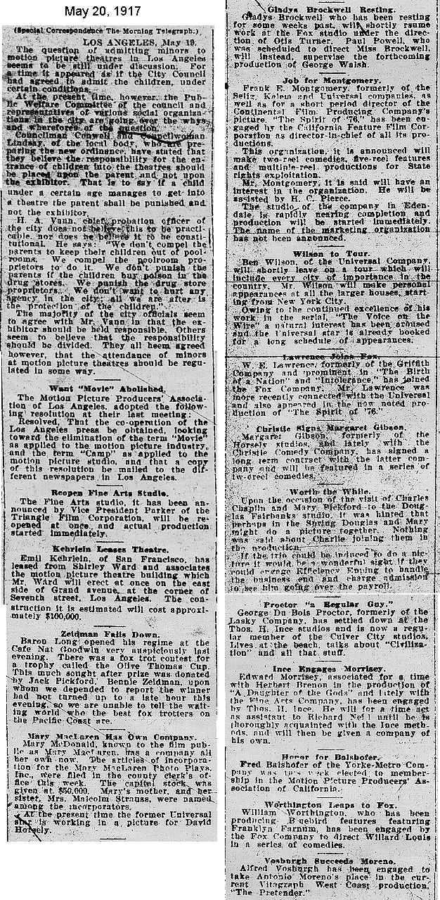 During the silent film era, the New York Morning Telegraph had more coverage of the film industry than any other daily New York newspaper; its coverage included a weekly column of movie news from Los Angeles, initially titled “Pacific Coast News.” As the film industry in Hollywood expanded, that column also grew in size. Many of the “news items” came directly from publicity agents, but they still provide a useful historic glimpse into Hollywood’s growing silent film industry. Major Hollywood news stories would have been given separate articles instead of a mention inside this column. The columnists of “Pacific Coast News” included Edward V. Durling, Clem Pope, Margaret Ettinger and Frances Agnew. During the 1980s, when I was seeking information on the film career of William Desmond Taylor, I cast my research net through a good number of newspapers, fan magazines, and movie trade publications. Since Taylor was directing in Southern California, I was surprised to find so many items on Taylor in the New York Morning Telegraph, which I had examined on microfilm obtained through interlibrary loan. Those columns of “Pacific Coast News” had so much information, and were so useful to me, that I photocopied them for future silent film references. Now, instead of just gathering dust in my garage, I have scanned those 1914-1922 “Pacific Coast News” columns for the web, so that anyone who is interested in silent film history will have access to the material. I did not photocopy the columns beyond February 1922, and the column was occasionally missing from the microfilm source material. Obviously, this material would be more useful if it were turned into word-searchable text instead of images. With the increasing availability of large amounts of free web space such as the Internet Archive, all available contemporary publications on silent film should be scanned and made freely available online, and I encourage people with copies of other contemporary silent film material to do so. In any event, I hope some of you will find useful information in these columns from the New York Morning Telegraph.